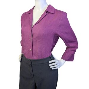 Beautiful vintage late 90s/early 2000s Lauren Ralph Lauren 100% linen button-up shirt in a rich berry tone awith a subtle herringbone texture. Vintage Ralph by Ralph Lauren 100% linen button-up in a rich berry tone. Very good condition with light wear and a couple of minor pulls to the fabric. Easy to tuck, layer, or wear open over a tank. A timeless elevated basic. Tagged size: M Best fit: Small–Medium (vintage sizing runs smaller) Please refer to measurements for best fit: Measurements (laid flat): • Pit to pit: 19" • Shoulder to shoulder: 16" • Sleeve length: 19" • Length (shoulder to hem): 25"