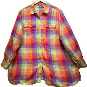 Lands' End Women's Button Down Linen Shirt Long Sleeve Multicolor Check Pockets