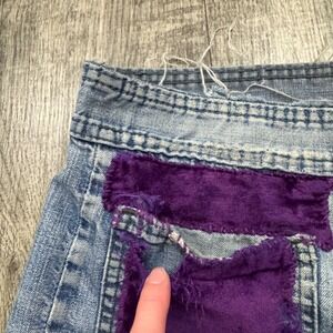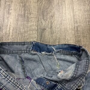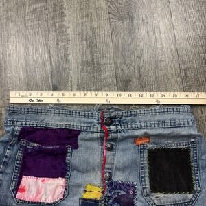 Has distressing/ wear as shown. Waist has been repaired. Has glue residue on back, could add another patch to cover up if desired.