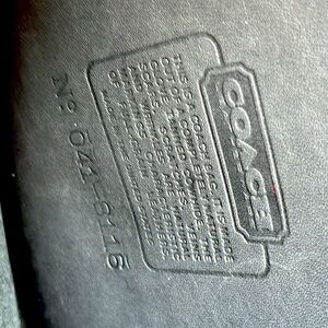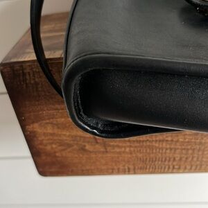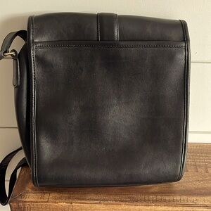 This Coach messenger bag showcases a sleek black leather design with a structured rectangular shape and rounded edges. The long strap allows for comfortable crossbody wear, making it a stylish and practical accessory for everyday use. Measures 9 x 11 inches with strap drop of 20 inches.