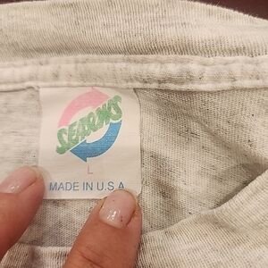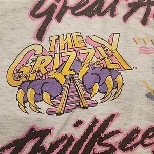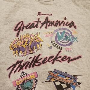 6 Flags Great America Thrillseeker Vtg 1990s Theme Park T-shirt Sz L Gray. T-shirt is in overall excellent condition with exception of the front of the left sleeve that has come unhemmed. This is a single stitch shirt. T-shirt itself is very light gray with marling type flecks. Designs are very vibrant.