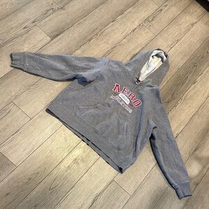 Soft hoodie with Aeropostale branding. Features blue and red tags. Ideal for everyday comfort. Junior size l large Aero Gray Hoodie in good used condition