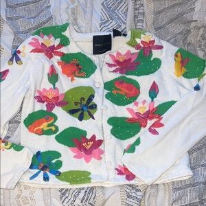 VINTAGE Michael Simon beaded frog & lily pad cardigan. Petite small.