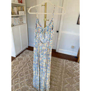 Description: This SO Goods For Life maxi dress is crafted from 100% rayon and features a soft pastel floral print with adjustable spaghetti straps, a gathered empire waist, and a flowing tiered skirt. Designed with a flattering V neckline and lightweight drape, it offers effortless movement ideal for warm weather and travel wear.