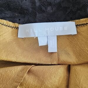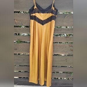 Hill House Home slip dress from 2024 in a gorgeous golden mustard tone with black lace detailing. Features a flattering V-neckline, delicate spaghetti straps, empire waist with lace trim, and an elegant vertical lace panel along the skirt for subtle asymmetry and movement.