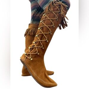 Vintage Minnetonka knee-high lace up tan/brown suede boots-made in the USA –8
