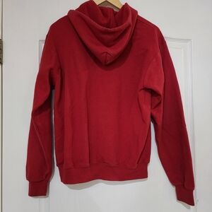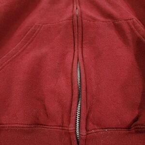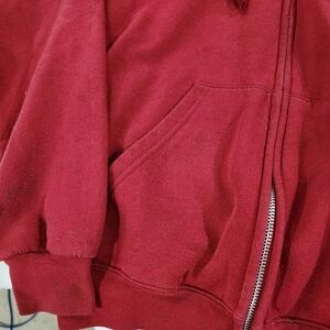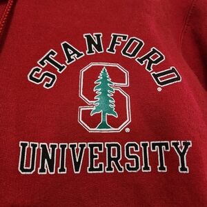 Purchased directly at the Stanford University Campus Store when I took my daughter for a visit. Cardinal red color with Stanford logo on left chest area. Zip front. Hooded sweatshirt with pull ties. Two front pockets. A few slight spots as shown in pictures on bottom right sleeve cuff area. Some more slight spots on right pocket. The ones on the cuff are more noticeable than the pocket. I had a hard time even getting the spots to show on the pocket! Size Adult Small. Durable Champion brand. No tears or snags. Aside from the spots this sweatshirt is in very good used condition.