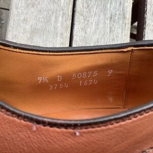A pair of Allen Edmonds Stockbridge Split Toe Oxford Dress Shoes in brown leather, designed for men in size 9.5 D. These classic shoes feature a round toe shape, lace-up closure, and a durable leather outsole. The brand Allen Edmonds is known for its high-quality craftsmanship and this shoe is part of the Stockbridge product line, perfect for formal occasions or adding a stylish touch to a dressy outfit. Made with leather lining and insole, these shoes are a timeless and versatile addition to any man's wardrobe. Excellent pre-owned condition.