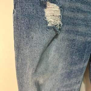Abercrombie & Fitch Ultra High Rise Ankle Straight Jeans, size 27 (equivalent to 4R). These stylish jeans feature heavy distressing and a light wash, perfect for a casual and trendy look. The ultra high-rise fit offers a flattering silhouette, while the ankle straight leg provides a modern cut. Made in China. Good pre-owned condition with intentional factory distressing, there is a small spot on the right upper thigh.