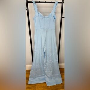 Elegant light blue long wide pant romper with lace trim. Light and breathable. Features a fitted bodice and flowing pants.