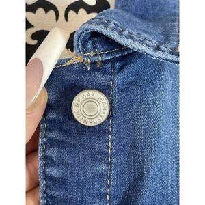 These XL vintage dark blue denim wax jeans are a stylish addition to any woman's wardrobe. Made from cotton denim, they feature a short jacket length with long sleeves and a button closure. The regular fit and stretch fabric make them comfortable for casual or travel occasions. With a 90s theme and pockets for added convenience, these basic denim wax jeans are versatile for all seasons.