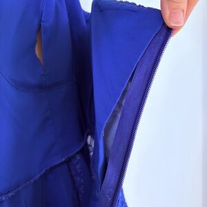 Sure to turn heads in this stunning, unique gown with gorgeous embroidered lace detail. It’s fun, sophisticated, sexy, feminine and playful all in one. It appears to have been altered near the zipper, but I’m not positive. The dress zips up and lays nicely.
