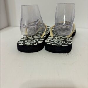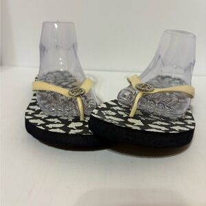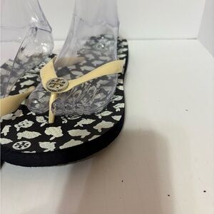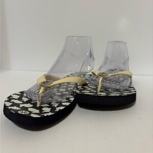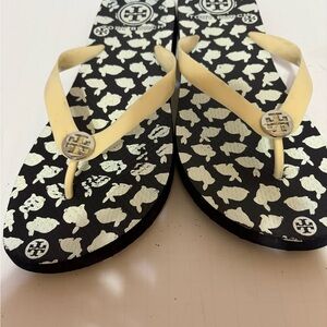 Tory Burch flip-flop sandals. These sandals feature a black sole with a white bunny print, and a prominent Tory Burch double-T logo medallion on the light-colored strap. Size 9/9.5