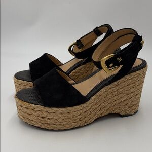 Stylish black wedge sandals with a chic design. Perfect for any occasion.