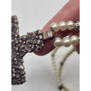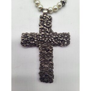 Brighton Lola Floral Cross Necklace Faux Pearl Beaded Long Statement Pendant