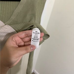 Features a flattering V-neckline with button front and a unique two-tone colorblock design in sage green and beige. Soft ribbed fabric with stretch for a comfy, fitted look. Perfect for layering or wearing on its own.