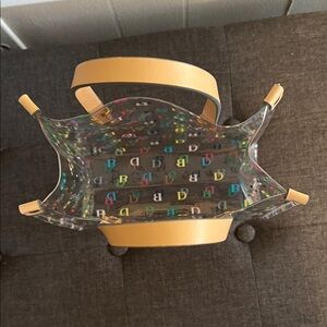 Chic clear tote with vibrant multicolor logo pattern. Features sturdy tan handles. Ideal for everyday use. Beautiful condition 8 1/2 inches across 8 1/2 inches high 3 1/2 inches deep.