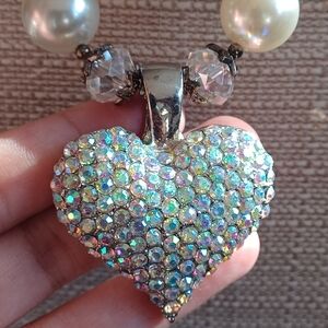 Large Y2K heart-shaped pendant fully adorned with pavé-set rhinestones that create an iridescent or "aurora borealis" effect, giving it a rainbow sparkle. Strands feature large, round faux pearls interspersed with smaller clear crystal bicone or faceted beads and larger, round, pavé-set rhinestone "disco" balls in a light green iridescent hue. The necklace uses a silver-tone metal chain and findings. The necklace is a convertible piece. Can detach the bottom part and use it as a bag charm! Theearringss i paired it with match perfectly with french hooks and crystal encrusted ball drops. Beautiful and Rare! All You Need is Love ❤️