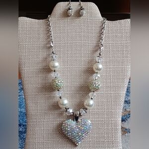 Y2K Silver-Tone Pave Crystal AB Heart Pendant Necklace & Earrings Set 💖✨️💫
