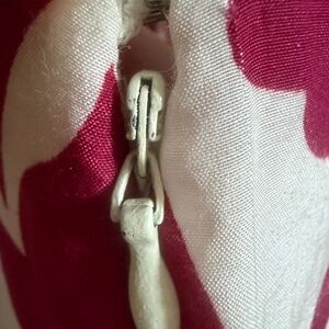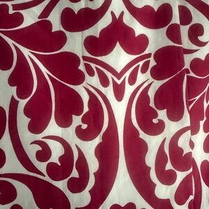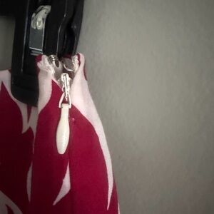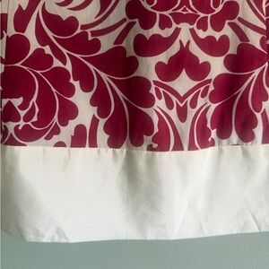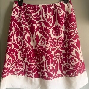 Chic A-line skirt with bold pink floral design on white. Ideal for a stylish look. Color is deep pink and not red. Side zip and metal clasp closure. Skirt is fully lined. Approximate flat measurement waist 14, length 21.5
