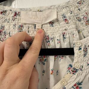 Elegant white blouse with colorful floral pattern. Features a gathered neckline and short sleeves. Perfect for casual outings.
