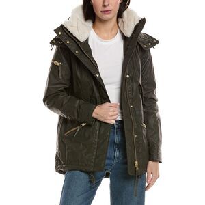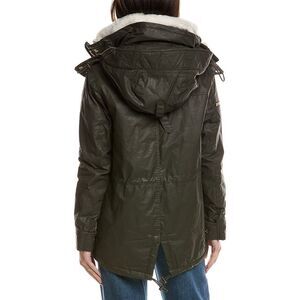 Color/pattern: military Approximately 27in from shoulder to hem Model is 5'9 and is wearing a size small. Measurements may vary slightly by size. Design details: stand collar, front zip pockets, right shoulder zip pocket, button cuffs, and drawcord waist Zipper front 70% cotton, 30% polyurethane Lining: 100% polyester Trim: 100% lamb shearling Clean by a fur specialist Imported
