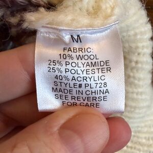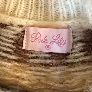 Pink Lily sweater with cream and brown hues. Ideal for cozy wear. Size medium, never worn! 10% wool, 25% polyamide, 25% polyester, 40% acrylic.