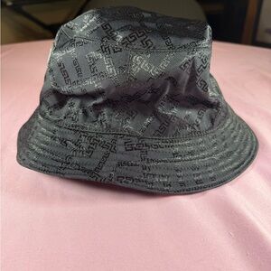 Elegant Versace bucket hat in dark black. Features signature logo tag inside. Size 58. Includes dust bag