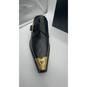 Keywords: Versace mules, black leather shoes, gold toe heels, Medusa shoes, designer heels, women's mules, buckle heels, Italian design, luxury footwear, statement shoes, runway fashion, high end, formal wear, party shoes