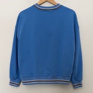 Stylish blue crewneck sweatshirt with striped cuffs and hem. Perfect for casual wear.