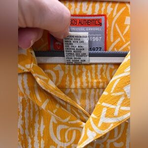This yellow-and-white patterned button-up is a vintage Bugle Boy Authentics shirt, from the 1990s.