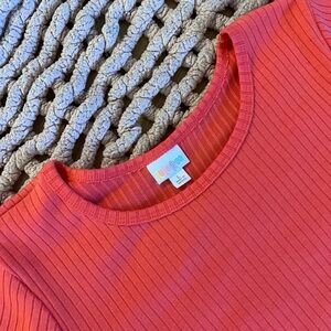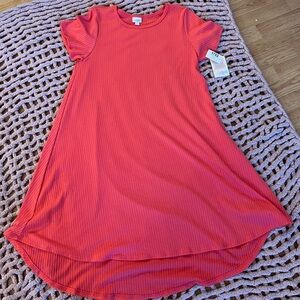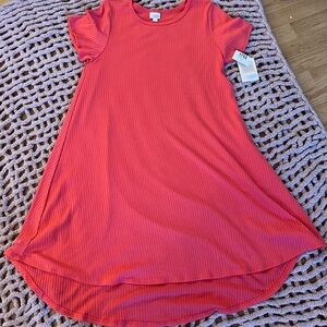 LulaRoe Carly dress in a beautiful pink coral color size Large hog low hem. Dress is new with tags. See photos