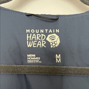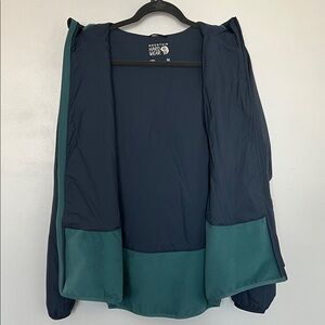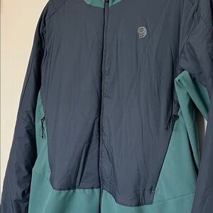 Men'sjacket by Mountain Hardwear. Features a dark blue body with teal accents.