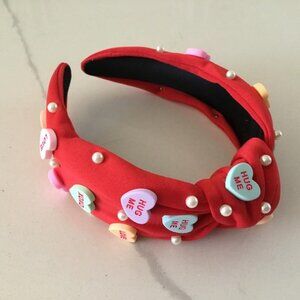 Conversation headband knotted and covered in conversation hearts and faux pearls