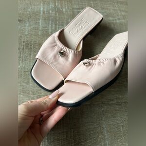 Salvatore Ferragamo Pink Leather Square Toe Slide Mules 8.5 Logo Charm Italy NEW