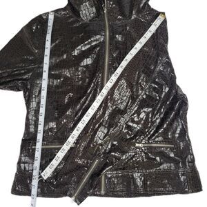 Just B dark chocolate brown faux snakeskin jacket is lightweight, unlined and has front full zipper. This jacket is in excellent preowned condition. Size XL. No flaws, tears, stains, damage. See photos for details and measurements.
