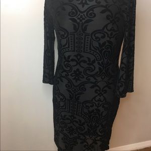 Black burn-out stretch velour knee-length sheath dress/tunic with 3/4 bell sleeve and nylon under layer