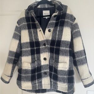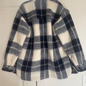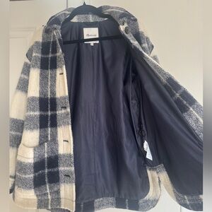 Stylish plaid jacket with button front. Features large pockets and a cozy hood.