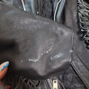Vintage stylish black leather jacket with fringe detailing.