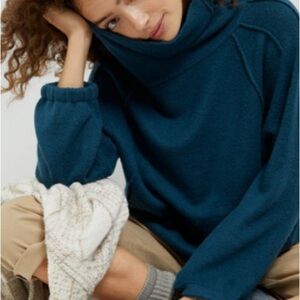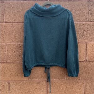 From Field & Flower for Anthropologie, this cozy and thick dark teal pullover features a roomy front pocket and a funnel neck cowl collar. Cropped with adjustable drawstring hem for flattering fit. See photos for gentle wear. NO flaws, stains or tears.