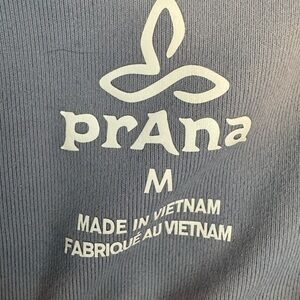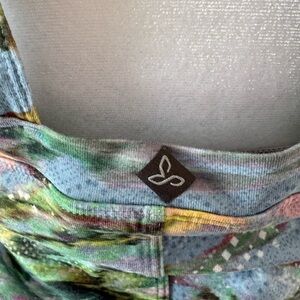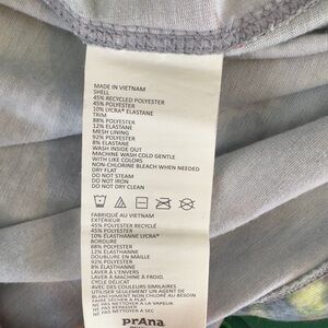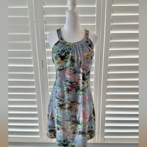 Gently worn Prana Cantina dress in blue graceful floral, size medium. Tank style, see photo of yellow dress above for the back style. Shelf bra. 45% recycled poly, 45% poly, 10% Lycra.
