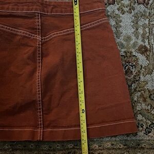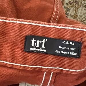 Chic burnt orange skirt with white stitching. Ideal for everyday wear. Zara is well known brand with stylish and on trend clothes. There is some wear on the skirt button. The material does not have stretch.