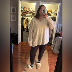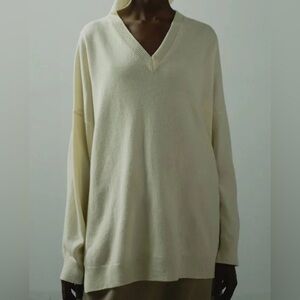 Beautiful Cordera cashmere-blend V-neck sweater in a soft cream / natural shade. Features Cordera’s signature relaxed oversized fit, dropped shoulders, and timeless minimalist silhouette.