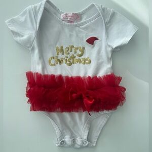 New, no tag. Charming white onesie with gold 'Merry Christmas' text and red Santa hat. Ideal for festive occasions.