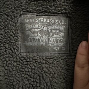 Classic Levi's jacket with a warm sherpa lining. Features a sleek black design. Ideal for layering.
