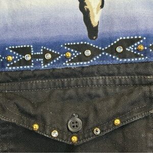 Vintage 90s Women’s L Western-style shirt shacket with bold blue accents. Features button-down front and chest pockets. Studded rhinestones. No fabric tags but I would guess all cotton.