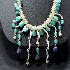 Description: Trifari fringe teal green frosty beaded silver tone necklace and matching earrings set.