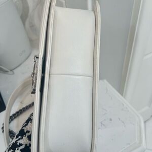 Chanel boy bag in white quilted leather. Size medium. Features a bold gunmetal chain strap and signature clasp. Excellent condition. Comes with dust bag, box, and certificate of authenticity. Posh will also authenticate. Is still sold in stores for $6,700. The only call out is tiny rub on circles gunmetal on top (not visible when worn as covered by chain). Please refer to pictures. Reasonable offers only please 😊