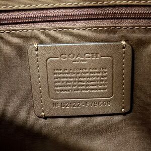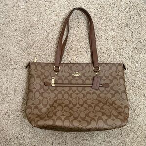 Classic Coach tote crafted from signature coated canvas with smooth Saddle brown leather trim and gold-tone hardware. Features the iconic khaki “C” print with structured leather handles for a timeless everyday look.