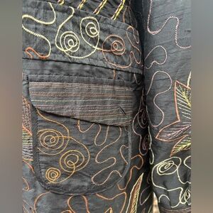 100% silk, hand-embroidered jacket made in Nepal. Beautiful stitched leaf and swirl design with a lightly quilted feel. Open front with buttons and pockets. Boho / artisan statement piece.